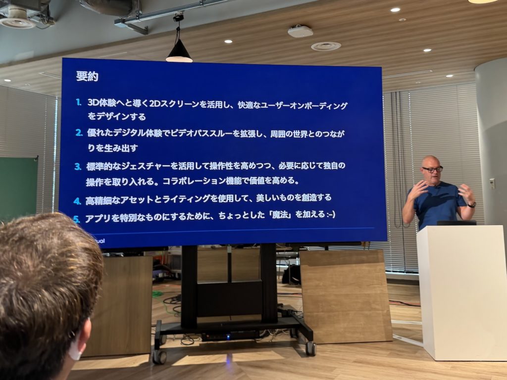 Day 2 でツールのことを質問した際に、Vision Pro という高額なデバイスにおいてはやはりユーザーのコンテンツに対する期待値も伴って高いため、上記のAI生成のモデルなどはあくまでプレイスホルダーとして用いて、プロダクションに利用することはおすすめしないというアドバイスを頂いた。